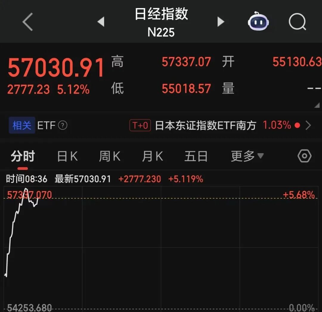 日经225指数日内高涨5.1%,报56999.60点。